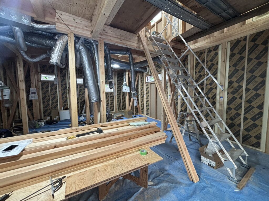 来週は、いよいよ 気密検査(C値測定) が予定されています。そのため現場では「小さなすき間が残っていないか」を一つひとつ確認しながら、最終のチェック作業を行っています。普段の生活では目に見えない部分ですが、この丁寧な下地づくりが、将来の快適さや省エネ性能につながっていきます。